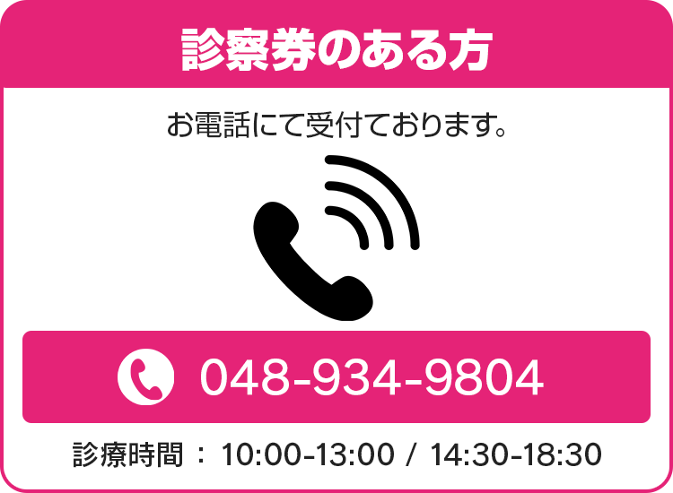 新規来院の際には、60分の診療時間が必要です。お問い合わせはお電話で承っております。TEL:048-934-9804